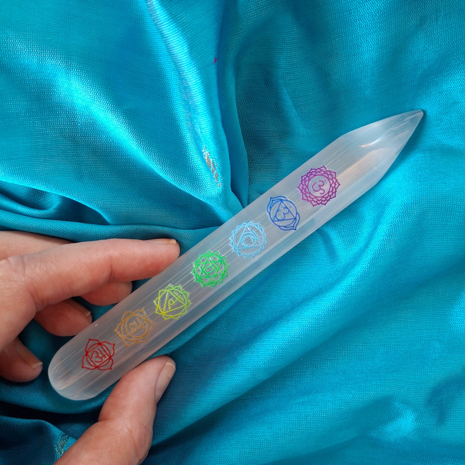 Selenite Chakra Wand – Engraved with Chakra Symbols for Reiki & Energy Healing
