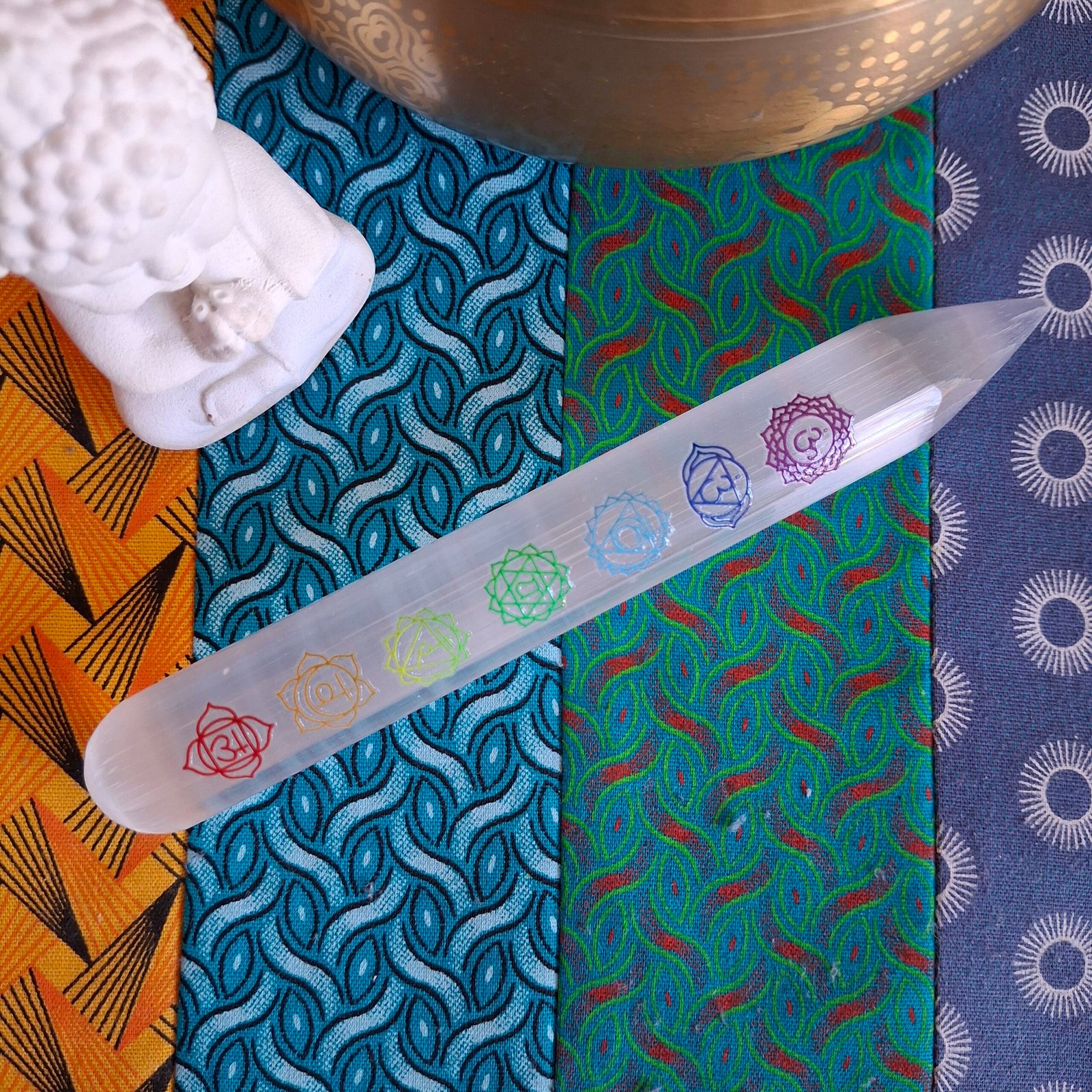 - 1 x Chakra Selenite Wand (14.5 cm long, 2 cm in diameter) – engraved 7 chakra symbols